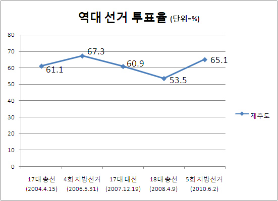 지난 18대 총선 제주도 전체 투표율은 53.5%. 전국(46.1%)에서 가장 높은 투표율을 보였다.