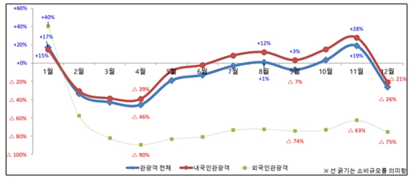 외국인 관광객은 무비자 제도 중단, 세계적인 해외여행 규제 등의 영향으로 4월 전년 동기 대비 마이너스 90%를 기록한 후 회복하지 못한 채 12월에도 마이너스 75%로 나타났다.