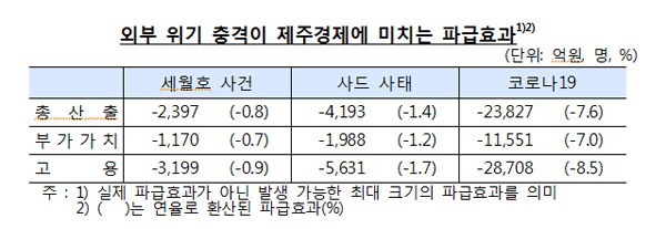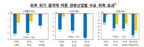 2014년 세월호 사건으로 제주도의 도매 및 소매업, 운수 및 창고업 수요는 각각 3.1%, 3.0% 둔화됐다. 같은 기간 전국적으로 각각 1.4%, 1.2%씩 위축된 것과 비교하면 2배 이상 큰 타격을 입었다.