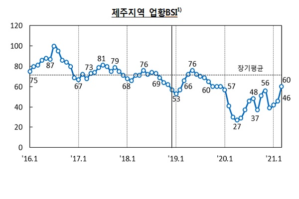 한편 지난달 제주도내 제조업 업황BSI(59)와 비제조업 업황BSI(60)는 전달과 비교해 각 4포인트, 14포인트 오른 것으로 조사됐다.