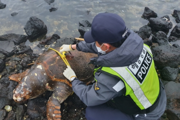 현장에 도착한 해경은 갯바위로부터 약 10m 떨어진 해상에 떠 있던 거북 사체를 인양해 전문가에게 문의했다고 알려졌다.