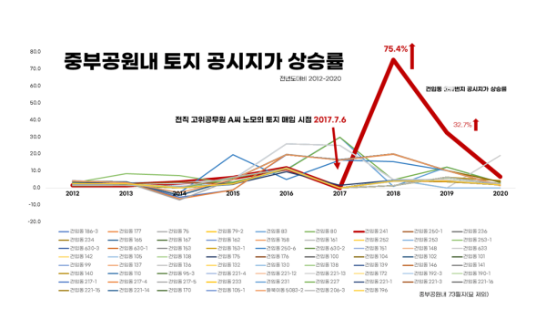 제주참여환경연대는 15일 논평에서 “또 하나 납득하기 어려운 사실이 발견되었다”며 “A씨 가족이 증여받은 중부공원 내 건입동 ○○○번지 경우 그의 노모가 2017년 매입한 다음해(2018년)부터 해당 토지의 공시지가가 급등, 2018년 공시지가는 전년 대비 75.4% 오른 것으로 확인됐다”고 밝혔다. 중부공원 내 다른 토지 상승률과 비교해도 월등히 상승한 공사지가를 보인다는 것이다.