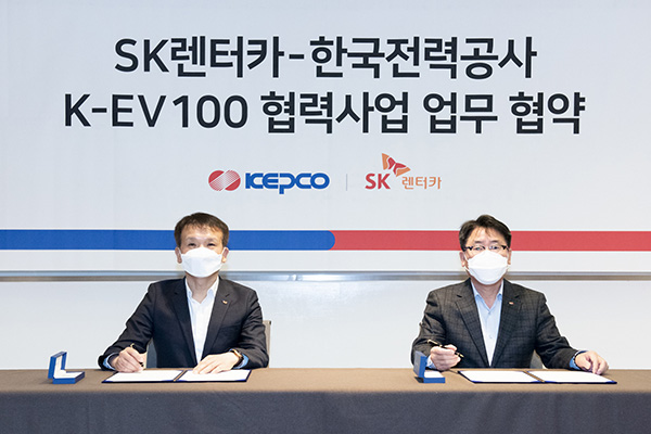 SK렌터카와 한국전력은 16일 서울 워커힐 아카디아에서 'K-EV100 협력사업' 협약을 체결하고 지난달 선언한 K-EV100(한국형 무공해차 전환 100)의 중점 과제 추진에 나선다고 밝혔다.