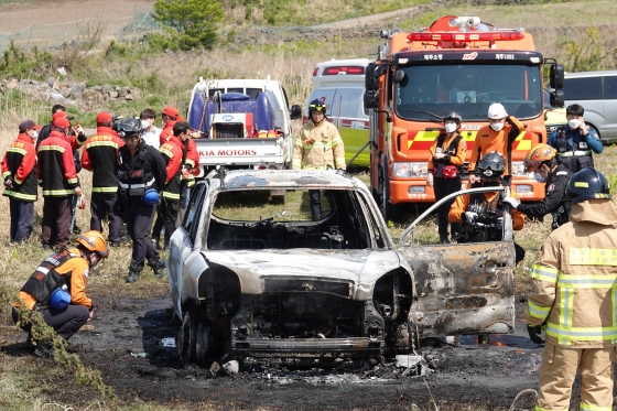 21일 제주소방안전본부에 따르면 지난 20일 오후 1시 47분께 제주시 용강동의 한 야초지에 주차된 승용차에서 불이 났다.