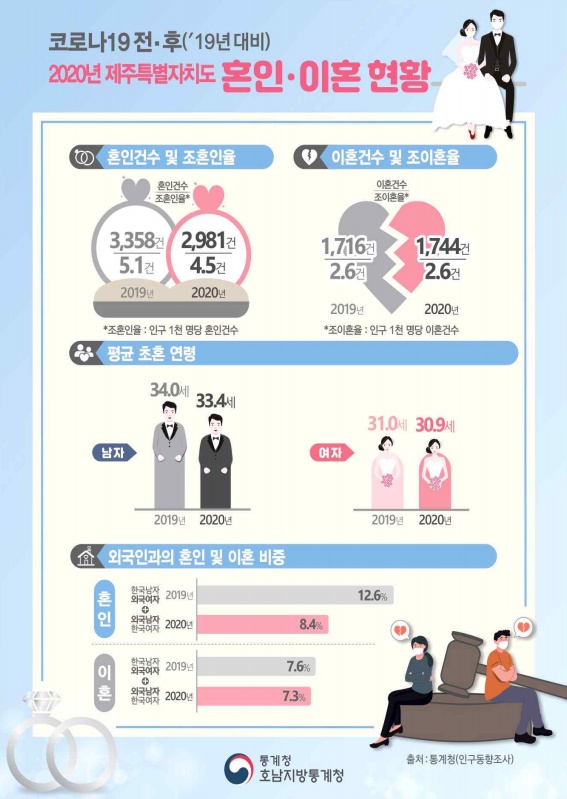 호남지방통계청이 26일 공개한 ‘2020년 호남·제주 혼인·이혼 현황 및 분석’에 따르면 지난해 제주지역 혼인건수는 2981건이다.