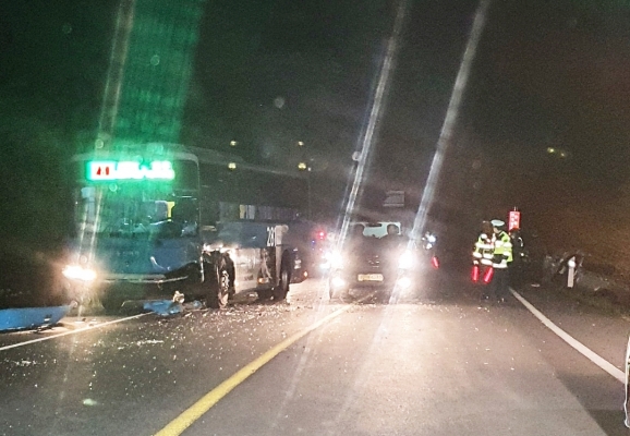 27일 제주동부경찰서 등에 따르면 전날 오후 10시35분쯤 제주시 용강동 제주마방목지 인근 5.16도로에서 서귀포시 쪽으로 가던 SUV 운전자 A씨(40)가 몰던 차량이 마주오던 시내버스를 들이받았다.
