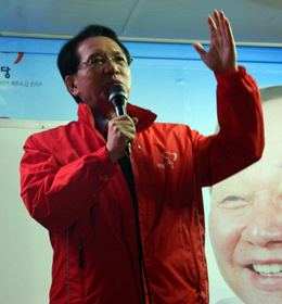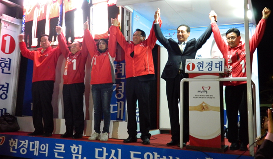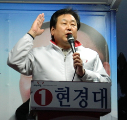 새누리당 김무성 의원은 이날 오후 7시께 제주시 노형노터리 인근 이마트 앞 현경대 후보 유세장에서 제주시 갑 무소속 장동훈 후보를 향해 "우파 후보 단일화를 위해 지지율이 현경대 후보의 3분의 1도 안 되는 장동훈 후보는 사퇴하고, 우파 단일화에 즉각 나서라"고 촉구했다.