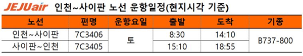 인천~사이판 노선은 주 1회 토요일에 운영한다. 인천에서 오전 8시30분(현지시각)에 출발해 사이판에 오후 2시10분에 도착하고, 사이판에서는 오후 3시10분에 출발해 인천에 오후 6시55분에 도착하는 일정이다.