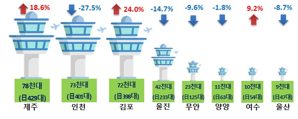 지난 1~6월 국토부 관할 8개 공항 관제탑에서 처리한 교통량은 ▲제주 7만8000대 ▲인천 7만3000대 ▲김포 7만2000대 ▲울진 4만2000대 ▲무안 2만3000대 ▲양양 1만1000대 ▲여수 1만대 ▲울산 9000대 순으로 집계됐다.