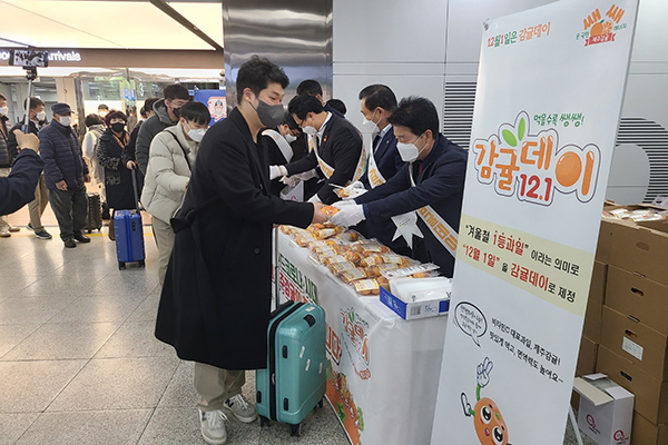 '감귤데이'인 1일 오전 제주감귤연합회와 농협중앙회 제주지역본부(농협 제주본부)는 제주국제공항 도착장 앞에서 감귤의 우수성을 홍보하며 감귤 나눠주기 행사를 가졌다.