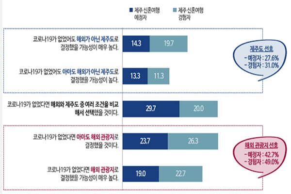 제주도를 선호한 예정자와 경험자는 각각 27.6%, 31.0%로 나온 반면, 해외 관광지를 선호한다고 응답한 예정자와 경험자는 42.7%, 49.0%로 높게 나타났다.