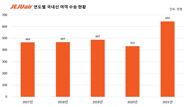 2017년 464만명이 제주항공을 이용한 이후 탑승객이 지속적으로 늘었으나 2020년에는 코로나19 확산에 따른 사회적 거리두기 강화와 여행심리 위축 등으로 432만명으로 줄었다. 하지만 지난해에는 645만명대로 증가했다.