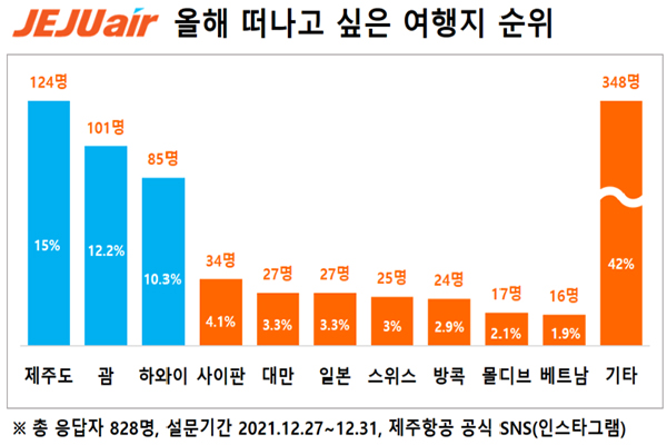 제주항공은 지난해 12월 27일부터 5일간 제주항공의 공식 사회관계망서비스(SNS)에서 ‘2022년에 떠나고 싶은 여행지’를 주제로 댓글 달기 설문을 실시한 결과 828명 중 124명(15%)이 제주도를 선택했다고 12일 밝혔다.