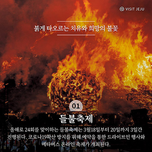 매년 3월 새별오름에서 개최되는 제주 들불축제는 오름에 불을 놓아 밤하늘을 붉게 수놓는다. 커다란 오름을 따라 일렁이는 붉은 불꽃, 과거의 나쁜 것들을 모두 태우고 새로운 상생을 맞이하는 시간. 올해로 24회를 맞이하는 들불축제는 3월 18일부터 20일까지 3일간 개최된다. 코로나19 확산 방지를 위해 예약을 통해 드라이브인 행사로 진행된다. 올해는 시민 참여 확대를 위해 메타버스 플랫폼을 활용한 온라인 축제도 개최한다.
