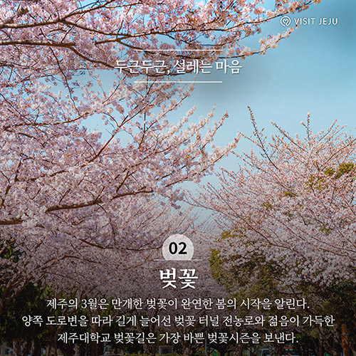 발그레한 볼처럼 분홍빛으로 물든 벚꽃이 수줍은 듯 고개를 내밀며 꽃망울을 터트린다. 제주의 3월은 만개한 벚꽃이 완연한 봄의 시작을 알린다. 코로나로 지치고 힘든 시기를 보낸 우리에게 벚꽃은 희망과 치유의 메시지를 보낸다. 제주공항에서 가장 가까운 벚꽃 명소는 제주도민도 즐겨 찾는 전농로이다. 양쪽 도로변을 따라 왕벚꽃나무가 길게 늘어서 벚꽃 터널을 따라 봄비처럼 살랑이며 떨어지는 모습을 감상하면서 SNS 인생사진을 남기기 좋다. 전농로 끝자락에 위치한 삼성혈에서는 사진을 찍기 위해 기다리는 사람들로 가장 바쁜 벚꽃시즌을 보낸다. 봄의 기운과 함께 젊음의 기운을 느끼고 싶다면 제주대학교 벚꽃길과 캠퍼스도 빼놓을 수 없는 벚꽃 여행지이다.