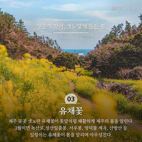 제주 곳곳 가장 먼저 피어난 샛노란 유채꽃이 그의 꽃말처럼 쾌활하게 제주의 봄을 알린다. 아직 추위가 가시지 않은 늦겨울부터 노란 물결을 일렁이는 유채꽃이 시린 손을 부여잡은 관광객들의 발걸음을 재촉한다. 푸른 바다와 파란 하늘을 배경으로 우뚝 솟아 존재감을 뽐내는 성산일출봉과 섭지코지, 에머랄드빛 바다 빛에 유채꽃 노란 물결이 맞닿아 진귀한 풍경을 자아내는 함덕 서우봉, 유채꽃과 벚꽃의 향연으로 한국의 아름다운 길로 선정된 녹산로, 계곡 사이사이 흩날리는 유채꽃과 벚꽃의 몽환적 분위기를 자아내는 엉덩물 계곡, 웅장한 산방산과 겹겹이 시간이 만들어낸 용머리 해안 등 제주 유채꽃 명소는 이번 봄 다 돌아보기에도 시간이 부족하다.