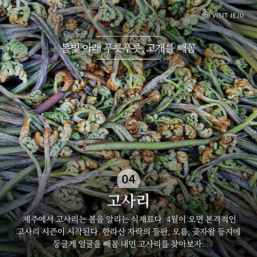 제주에서 고사리는 봄을 알리는 식재료다. 4월이 오면 본격적인 고사리 시즌이 시작된다. 한라산 자락의 들판, 오름, 곶자왈 등지에서 자라는 제주의 ‘먹고사리’는 다 자란 잎이 아니고 끝부분이 둥글게 말려 있는 어린 고사리이다. 특히 비가 내리고 그친 새벽, 비를 흠뻑 맞은 고사리는 하루 만에 키가 쑥쑥 크고 통통해진다. 고소한 고사리 나물볶음, 노릇한 제주 흑돼지와 같이 구워내는 고사리, 수육과 고사리를 넣고 푹 끓여 낸 육개장 등 제주에서는 다양한 방법으로 고사리를 즐긴다. 혈액을 맑게 해주고 신진대사를 원활히 해 몸속 노폐물 배출에 효과적인 고사리는 4월 지친 몸을 달래기에 제격이다.