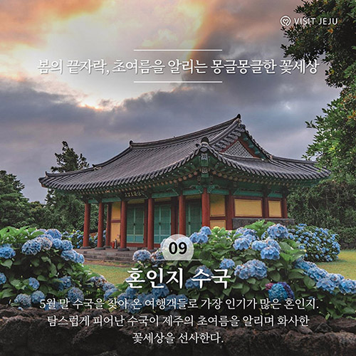 삼성혈에서 태어난 제주의 시조 고, 양, 부 삼신인이 바다 건너온 공주와 혼인식을 올린 전설을 품은 이곳. 5월이면 수국을 찾아온 여행객들로 가장 인기가 많은 혼인지이다. 탐스럽게 피어난 수국이 제주의 초여름을 알리며 화사한 꽃세상을 선사한다. 제주의 전통가옥을 배경으로 좁은 길 양옆으로 펼쳐진 수국의 모습에 감탄이 절로 나온다.