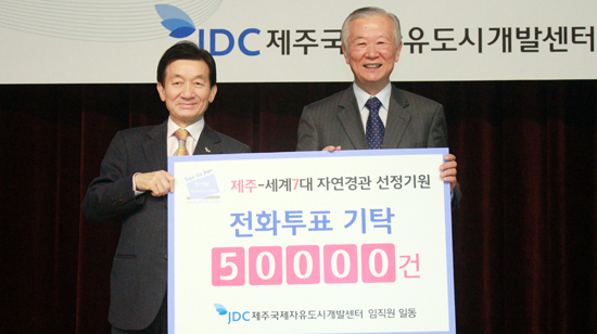 JDC는 이날 임직원들이 성금한 5만건의 전화투표기탁증서를 부만근 세계7대자연경관선정 범도민추진위원회 위원장에게 전달했다.