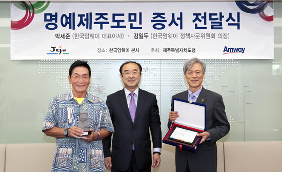 제주도는 지난 8일 서울 삼성동 한국 암웨이 본사에서 전달식을 갖고 이들에게 명예제주도민증과 인증패를 수여했다고 밝혔다.