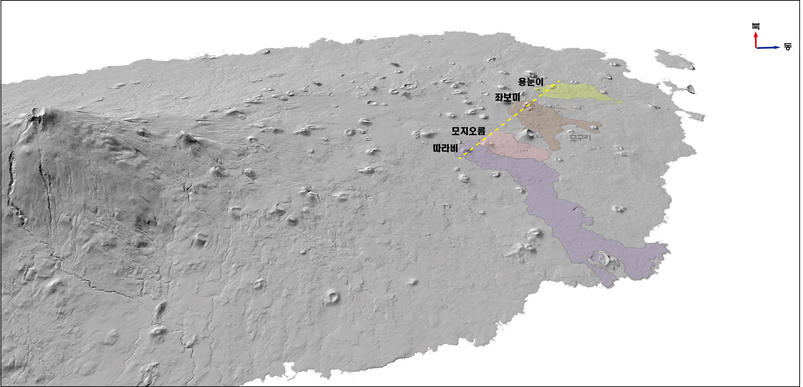 제주도 세계유산본부는 제주 동부 지역 따라비·모지·좌보미·용눈이 오름 4곳이 약 1만5000~1만6000년 전 북동–남서(NE–SW) 방향 선상 열극을 따라 연속적으로 분출한 화산활동으로 추정된다고 19일 밝혔다.
