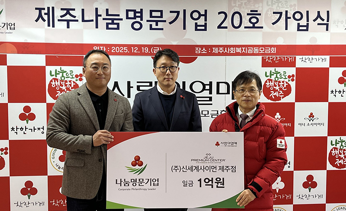 나눔명문기업 가입식은 이날 오전 사회복지공동모금회 제주지회에서 열렸다. 가입식에는 박지윤 신세계사이먼 점포운영담당 상무, 정상기 신세계사이먼 제주점장, 강지언 제주사회복지공동모금회 회장 등 관계자들이 참석했다.