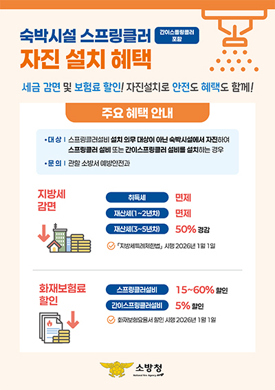 이번 할인 혜택은 건축 당시 스프링클러설비 설치 의무 대상이 아닌 숙박시설이 스프링클러 설비나 간이스프링클러 설비를 설치하고, 소방시설 완공검사증명서를 발급받은 경우에 적용된다.