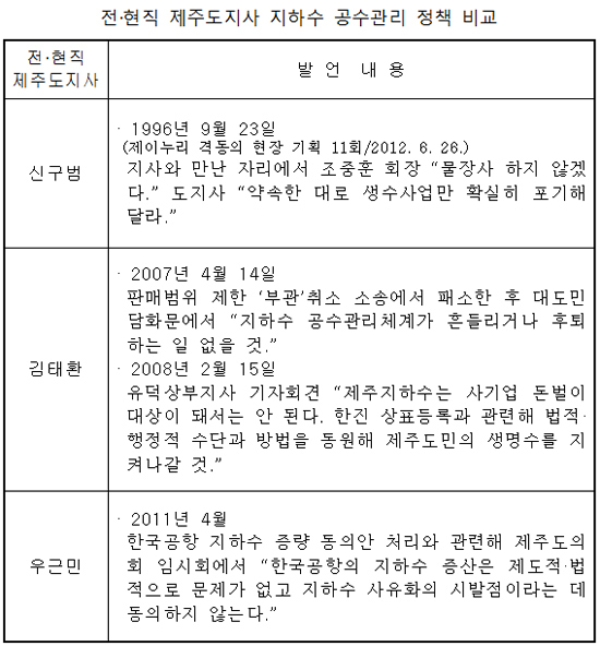 특히 이렇게 날뛰도록 방치하고 있는 것은 우근민도정이다. 지난 신구범도정이나 김태환도정 때에는 결단코 증량을 불허하면서 공수화 정책을 유지했는데 우근민도정은 한진그룹에 끌려가는 듯 우호적인 정책을 펴고 있다. 이 같은 사실은 전·현직 도지사의 발언 내용에서 분명한 차이를 확인할 수 있다<표 참조>. 우근민 도지사는 2011년 4월 한진그룹 지하수 증량 동의안 처리에 앞둬 제주도의회 임시회에서 “한국공항의 지하수 증산은 제도적·법적으로 문제가 없고 지하수 사유화의 시발점이라는 데 동의하지 않는다.”라고 발언하고 있다.