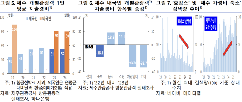 특히 '맛집 여행' 등을 중시하는 경향에 따라 식음료비 지출을 늘리고 숙소 선택에 있어 팬데믹 기간 성행했던 '호캉스·풀빌라' 등 고가 숙소보다는 '가성비 숙소'에 대한 선호도가 증가하면서 내국인 1인당 관광객 지출 중 숙박비 감소 폭이 18.1%로 가장 컸다.