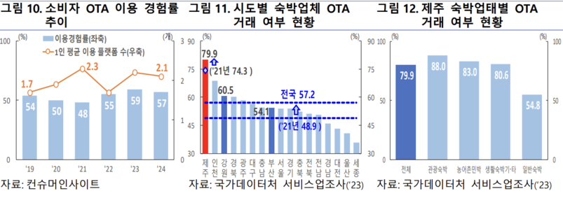 보고서에 따르면 코로나19 팬데믹이 엔데믹으로 전환된 2023년 야놀자, 마이리얼트립, 네이버 여행 등 국내 온라인 여행사와 에어비앤비, 부킹닷컴, 트립닷컴 등 해외 온라인 여행사를 통한 제주지역 숙박업체 거래 비중은 79.9% 다.