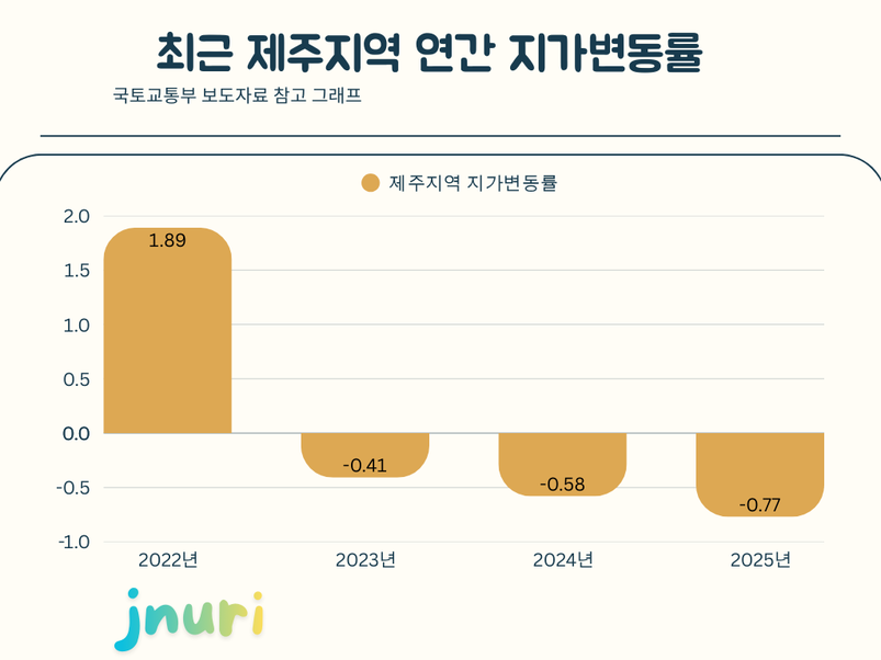 제주 지역의 지가는 2023년 -0.41%, 2024년 -0.58%에 이어 2025년에도 하락폭이 더욱 확대됐다. 3년 연속 내림세를 보이는 지역은 제주가 유일하다.