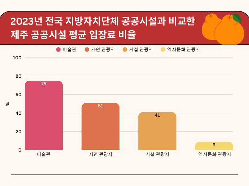 제주 공공시설물의 적자 문제는 전국 평균보다 낮은 입장료가 가장 큰 원인으로 꼽힌다. 제주연구원이 2023년 전국 지방자치단체 공공시설 평균 입장료와 비교한 결과 제주 공공시설의 입장료는 미술관 75%, 자연 관광지 51%, 시설 관광지 41%, 역사문화관광지 9% 수준에 머물렀다.
