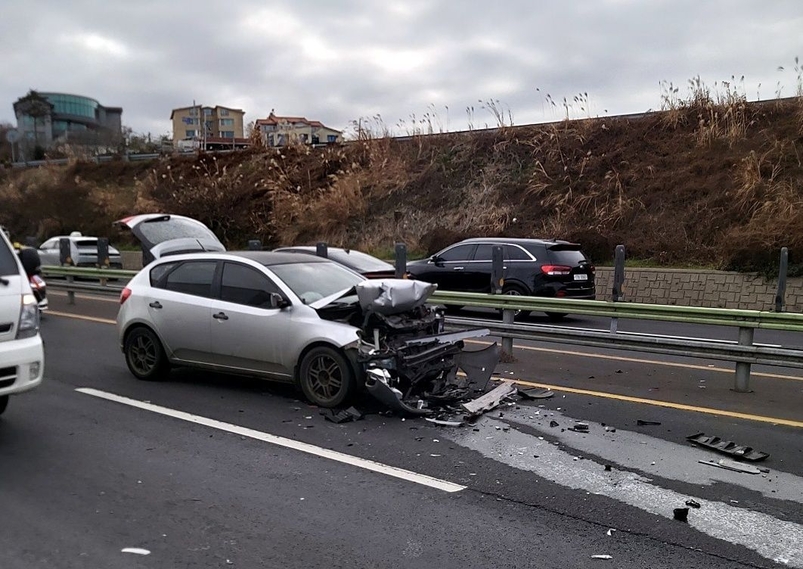 9일 제주소방안전본부에 따르면 이날 오후 3시 50분쯤 제주시 애월읍 광령리 평화로에서 K5와 캐스퍼, 투싼, 포르테 등 차량 4대가 잇따라 충돌하는 사고가 발생했다.