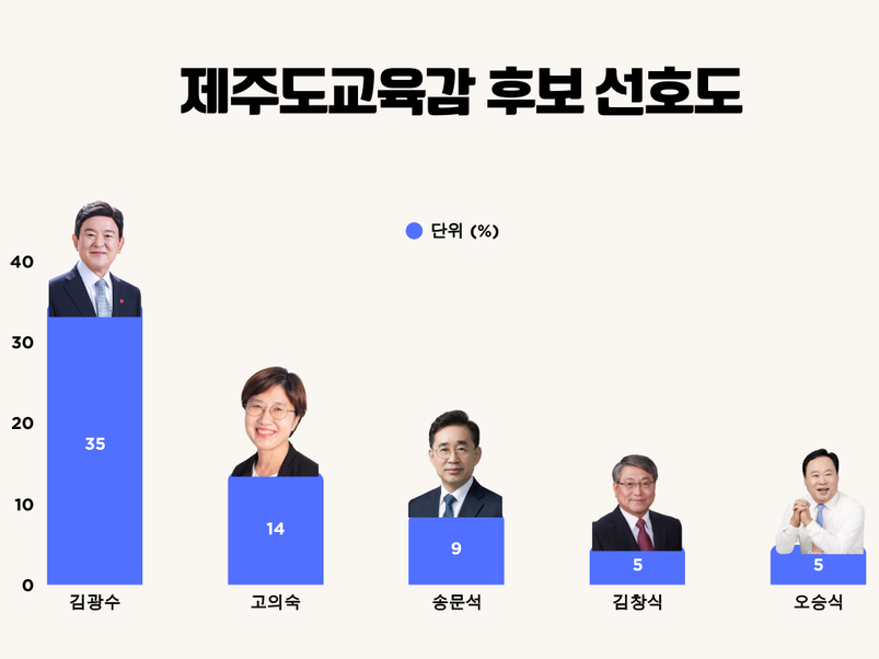 고의숙 제주도의회 교육의원은 14%, 송문석 전 서귀중앙여자중학교 교장은 9%, 김창식·오승식 제주도의회 교육의원은 각각 5%로 나타났다.