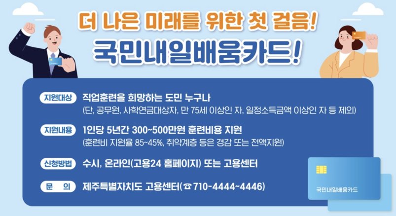 국민내일배움카드는 1인당 5년간 300만 원(최대 500만 원) 한도 내에서 훈련비를 지원, 발급하는 카드다. 훈련생은 계좌 한도 내에서 자율적으로 훈련과정과 훈련기관을 선택할 수 있다. 국민내일배움카드로 훈련 수강하는 경우 일반훈련생은 직종평균 취업률(과거 3년 평균)에 따라 훈련비의 45~85%까지 지원받을 수 있다. 장애인, 기초생활수급자 등 취업취약계층 훈련생은 훈련비 부담을 낮춰 훈련 참여를 유도하고자 훈련비의 80~100%까지 우대 지원한다.