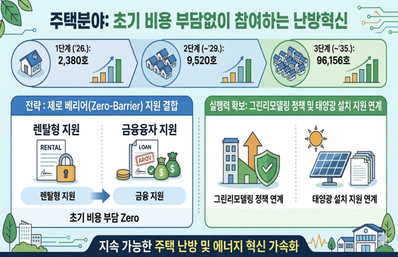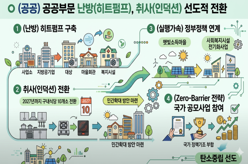 설치비 70%를 보조하고 나머지 자부담분도 렌털이나 저리 융자로 지원해 초기 비용 부담을 사실상 없앤다. 마을회관·복지시설·어린이집 등 공공부문에 히트펌프를 우선 도입한다.