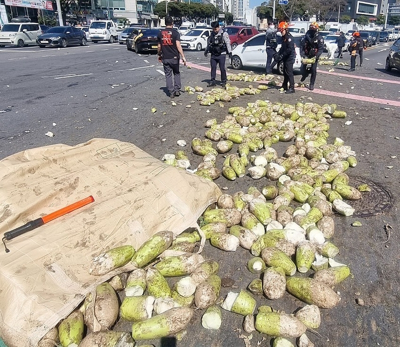 13일 제주도소방안전본부와 제주경찰청에 따르면 이날 오후 2시 10분께 제주시 노형오거리에서 25t 트럭 적재함에 실려 있던 월동무가 도로에 떨어졌다는 신고가 접수됐다.