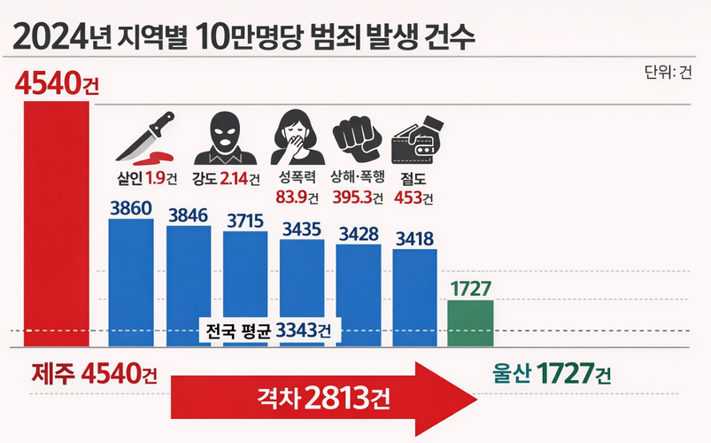 특히 제주의 범죄율은 전국 평균보다 크게 높고, 상위권 지역과 비교해도 앞자리 숫자부터 차이가 날 정도로 격차가 크다.