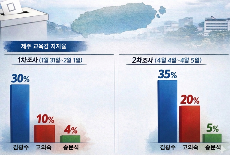앞서 언론 5사가 1월 31일과 2월 1일 실시해 2월 3일 발표한 1차 여론조사에서는 김광수 교육감 30%, 고의숙 예비후보 10%, 송문석 예비후보 4%였다.
