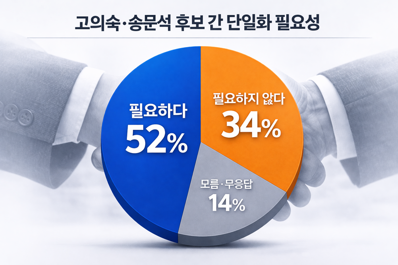 고의숙·송문석 후보 간 단일화 필요성에 대해 '필요하다'는 응답이 52%로 과반을 넘겼다. 반면 '필요하지 않다'는 응답은 34%에 그쳤다.