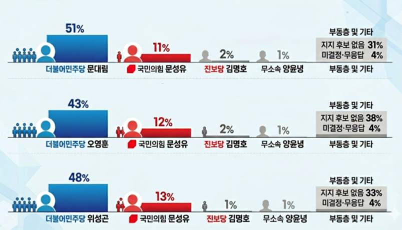 문대림 의원이 민주당 후보로 나설 경우 51%를 기록하며 과반을 넘겼다. 국민의힘 문성유 후보는 11%, 진보당 김명호 후보 2%, 무소속 양윤녕 후보 1%로 조사됐다. 지지 후보 없음은 31%, 미결정·무응답은 4%였다.