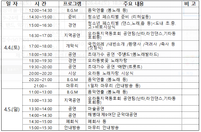 - 개막식, 청소년 페스티벌, 지역동호회 공연, 초대가수 공연