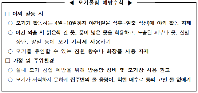 확인됨에 따라 전국에 일본뇌염 주의보를 발령하였습니다. 최근 기온 상승의 영향으로 모기의 출현이 빨라                  진 것으로  추정됩니.