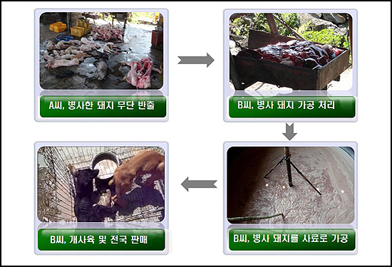 살모넬라균과 대장균 등 전염병으로 폐사한 돼지를 개에게 먹여 전국으로 유통시킨 일당이 붙잡혔다.