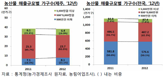 농산물 매출액이 500만원 이하인 영세농가의 수는 2011년보다 1000가구(2.7%p)가 증가했다. 또 5000만원 이상인 고소득농가수도 300가구(1.0%p)가 증가했다. 비중으로 볼 때는 변화폭은 전국평균 0.1%p, 0.3%p보다 큰 것으로 나타났다.