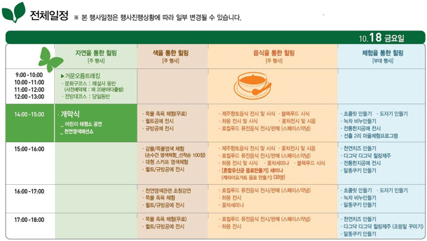이번 축제에서는 블랙푸드와 로컬푸드 퓨전음식, 꽃차 등을 시식할 수 있다. 게다가 참가자들은 슬로푸드와 꽃차의 지속적인 발전 방향을 논의하는 세미나도 참가할 수 있다.