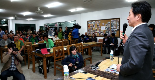 원희룡 지사는 15일 밤 강정마을 의례회관에서 강정주민 주도의 진상조사위원회 구성 지원을 약속했고, 8년 간 쌓여왔던 강정주민의 고충과 불만을 경청했다.