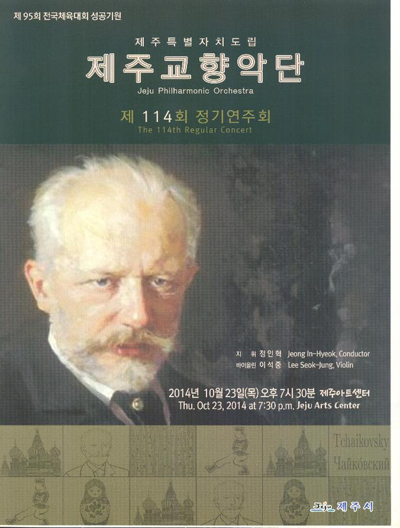 이번 정기연주회는 도립제주교향악단 정인혁 상임지휘자의 지휘로 세계적인 젊은 바이올리니스트로 도약하고 있는 이석중 바이올리니스트가 차이코프스키 바이올린 협주곡을 협연한다.