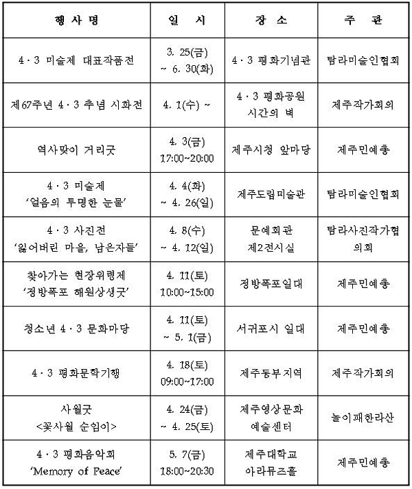 제주도는 4·3 67주년을 맞아 4·3을 기리는 문화예술축전이 도내 곳곳에서 열린다고 30일 밝혔다.