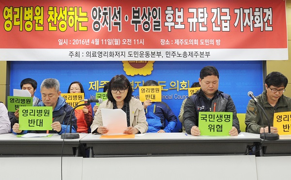 민주노총 제주본부와 의료영리화저지 도민운동본부가 11일 "영리병원에 찬성한 4·13총선 후보인 제주시 갑 선거구 새누리당 양치석 후보와 제주시 을 선거구 새누리당 부상일 후보에 대해 낙선운동을 펼치겠다"고 밝혔다.